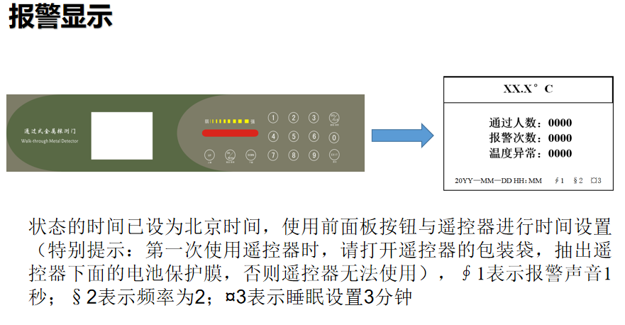 聲光報(bào)警,音調(diào)快慢可區(qū)分金屬物大小,多種報(bào)警音量模式適用于不同場合的選擇,通過門柱左右超亮LED報(bào)警燈可準(zhǔn)確顯示人體相應(yīng)高度藏匿的違禁物品。測溫報(bào)警:提示體溫異常;