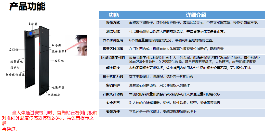 進(jìn)口雙探頭專業(yè)測溫門:有機(jī)將紅外測溫采用進(jìn)口醫(yī)學(xué)專用紅外雙探頭,上下兩個(gè)探頭可以調(diào)整,更有利檢測成年人和小朋友,先進(jìn)行紅外人體測溫,真人發(fā)音報(bào)警,提示體溫異常,有效防止規(guī)模性疾病傳染;